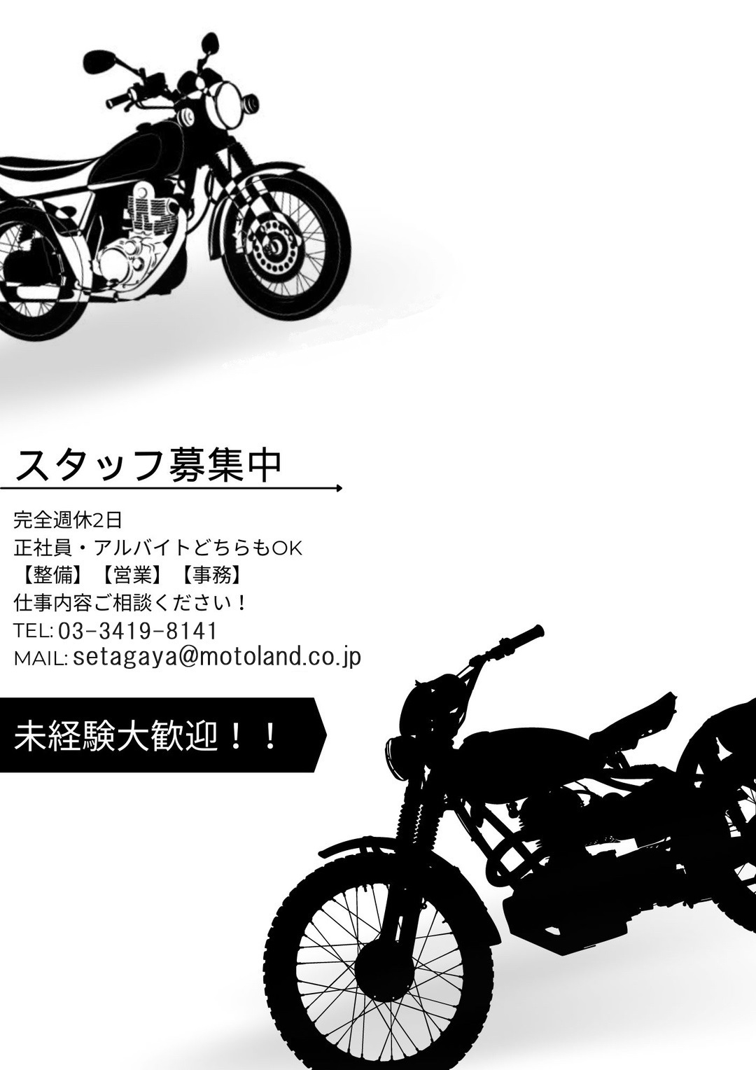 モトランドで元気で明るく一緒に働いてくれるスタッフを募集いたします!!オートバイに少しでもご興味あればOK!!是非、私たちと一緒にモトランドというオートバイに乗って、暑いとき、寒いとき、晴れの日、雨の日、様々な風を感じてみませんか?